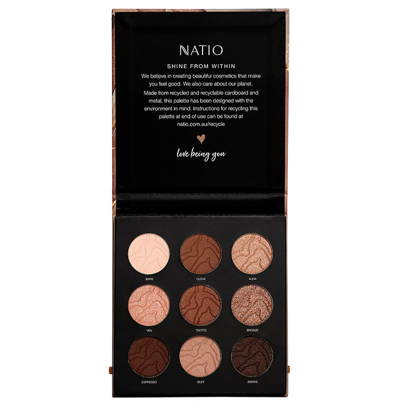 Bring lustre and depth to eyes, with this highly pigmented palette of terrestrial-toned mineral eyeshadows. Inspired by the glorious, gleaming vibrance of natural Australian treasures, the curated collection of nine earthy tones - in a versatile mix of satin, metallic and matte textures - offers a multitude of flattering looks to enhance your unique, natural beauty so you can shine from within. Designed with the environment in mind, this palette is made from recycled and recyclable cardboard and metal for recycling after use.