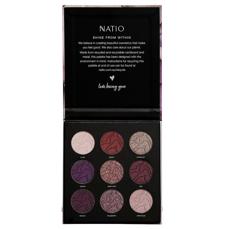Veil eyes in mystical opalescence in shades of sparkling lilac, grape, mauve and more, with this highly pigmented palette of purple-toned mineral eyeshadows. Inspired by the glorious, gleaming vibrance of Australia’s subterranean treasures, the curated collection of nine amethyst eyeshadow tones – in a versatile mix of satin, metallic and matte textures – offers a multitude of flattering looks to amplify your unique, natural beauty so you can shine from within. Designed with the environment in mind, this palette is made from recycled and recyclable cardboard and metal and should be recycled after use.