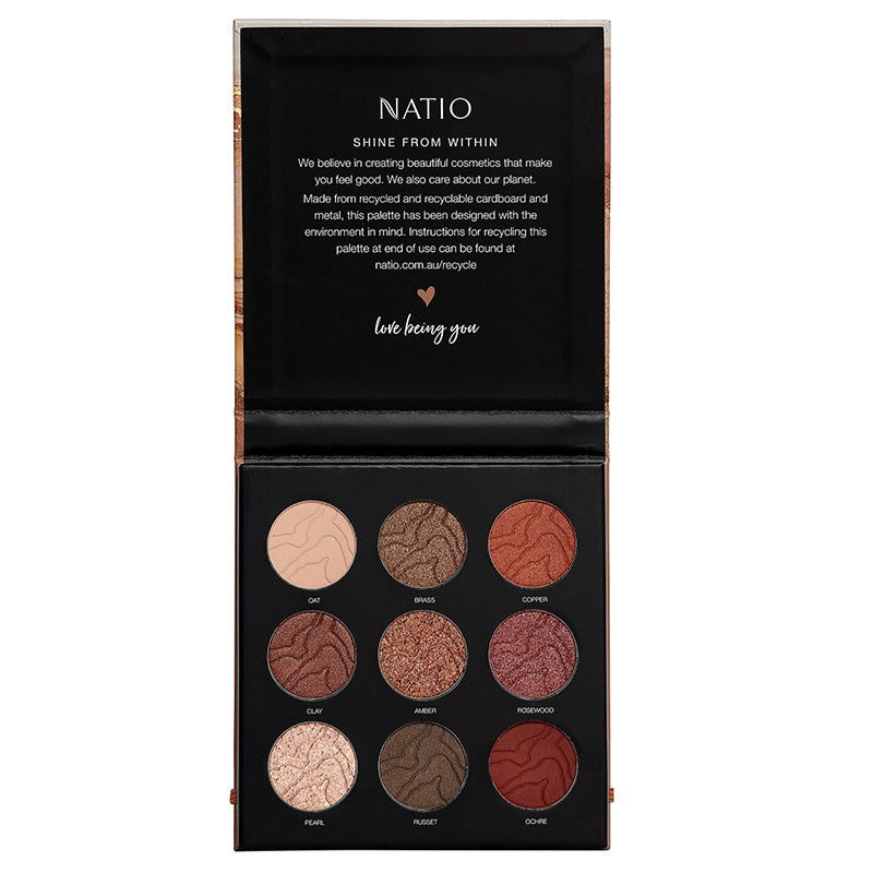 Bathe eyes in the warm, seductive radiance of luminous honeyed hues with this highly pigmented palette of rich, resin-toned mineral eyeshadows. Inspired by the glorious, gleaming vibrance of Australian subterranean treasures, the curated collection of nine amber tones – in a versatile mix of satin, metallic and matte textures – offers a multitude of flattering looks to intensify your unique, natural beauty so you can shine from within. Designed with the environment in mind, this palette is made from recycled and recyclable cardboard and metal and should be recycled after use.